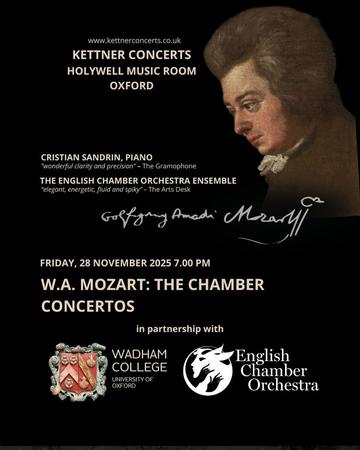 Join Cristian Sandrin, an outstanding pianist we are privileged to have as our co-Artistic Director, and the renowned English Chamber Orchestra Ensemble in a fresh presentation of Mozart's beloved piano concertos K414, K415 and K449, performed as piano quintets. Cristian is blazing a trail by shedding a new light on classical works. Also returning to the Kettner Concerts series is the chamber ensemble of the famous English Chamber Orchestra. Together they will reveal all the spell-binding complexity of these masterpieces of the concerto repertoire in the intimate setting of one of Europe’s oldest concert halls: the Holywell Music Room in the heart of the city of Oxford.